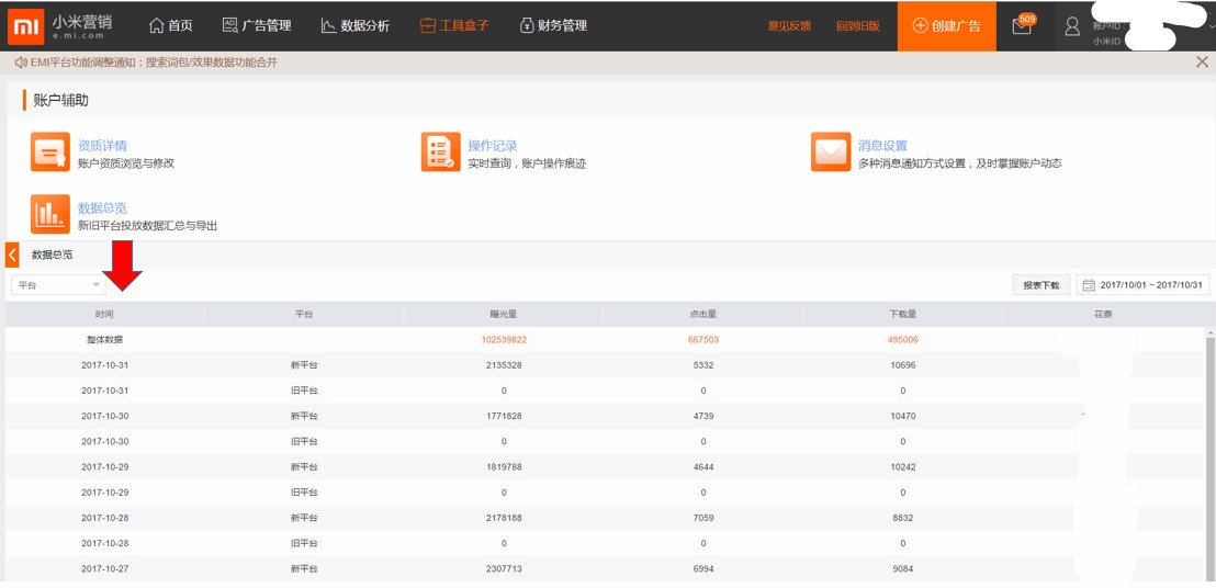 数据总览:目前新版及旧版EMI数据未打通,旧版的投放数据仍在旧版查看,新版的广告投放数据在新版查看,小米广告账户如在新旧版中均有投放,支持新旧平台数据汇总查询(图为子账户查询示例)。