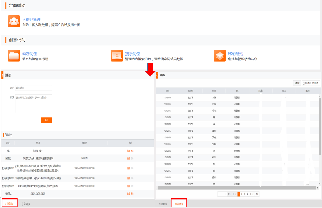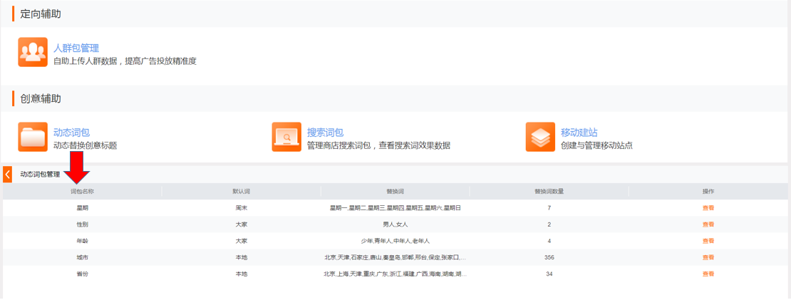 动态词包: 动态创意是系统根据用户属性替换创意标题中的部分关键词,以达到增强创意对用户的吸引力、提高点击率。目前系统支持5种系统词包:省份词包,城市词包,日期词包,年龄词包,性别词包。(详见:《辅助工具—动态创意》)
