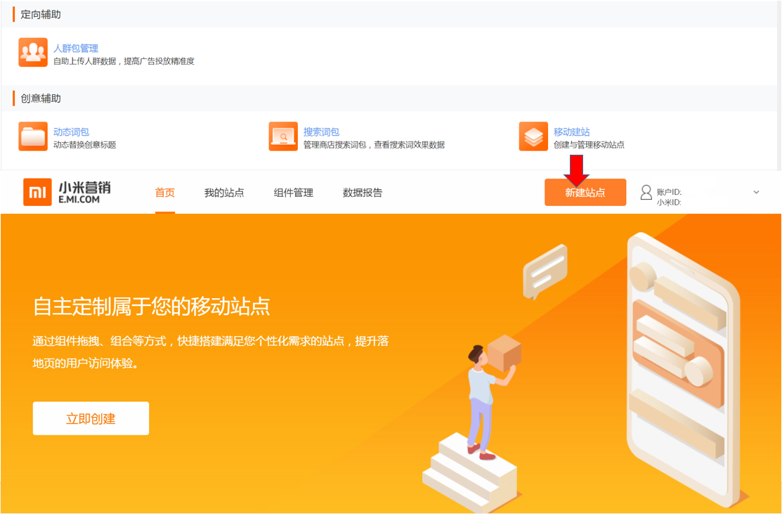 移动建站:为小米广告主自主定制专属移动站点推出的功能,广告主可以通过拖拽和组合组件等方式,快速搭建满足其个性化需求的站点,并将站点用于EMI投放平台推广使用,提升落地页的用户访问体验,提升推广效果。