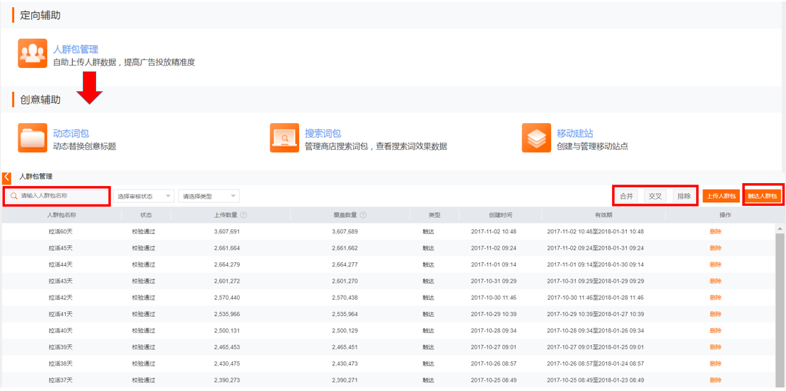 人群包管理:新版EMI平台提供多种建立人群包的方法,不仅可直接上传人群包,还可根据触达人群类型,时间,次数自定义人群包。并且可以根据人群包之间的合并,交叉,排除关系来建立新人群包。