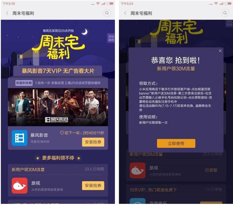 周末福利活动是针对用户周末使用APP的场景而提供的福利活动,过往提供的福利资源中效果比较好的有:视频会员、音乐会员、流量资源、阅读会员等。