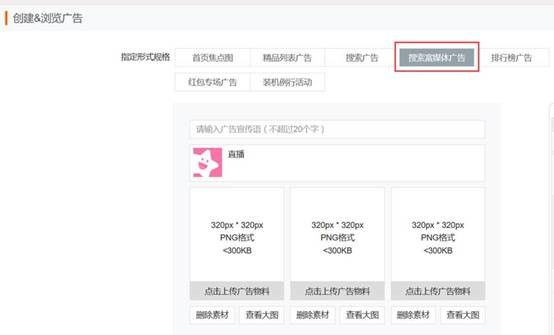 设置位置:广告计划 [商店] -广告组 [应用商店]- 广告创意 [搜索富媒体],绑定搜索词包,上传素材。