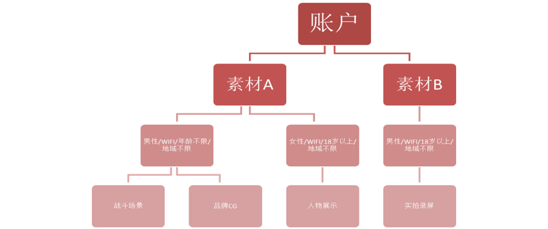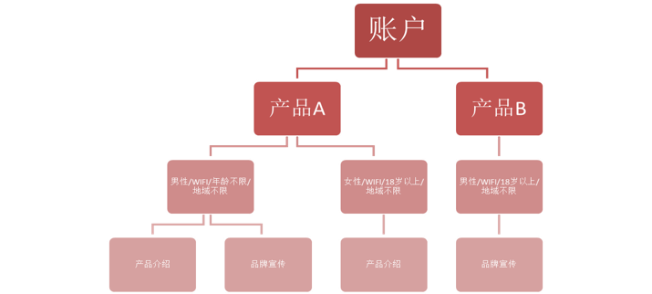 从大至小,依次分为四大层级:广告账号、广告计划、广告组、广告素材。每层之间均为一对多的关系,即广告账号可以包含多个广告计划,依次类推。