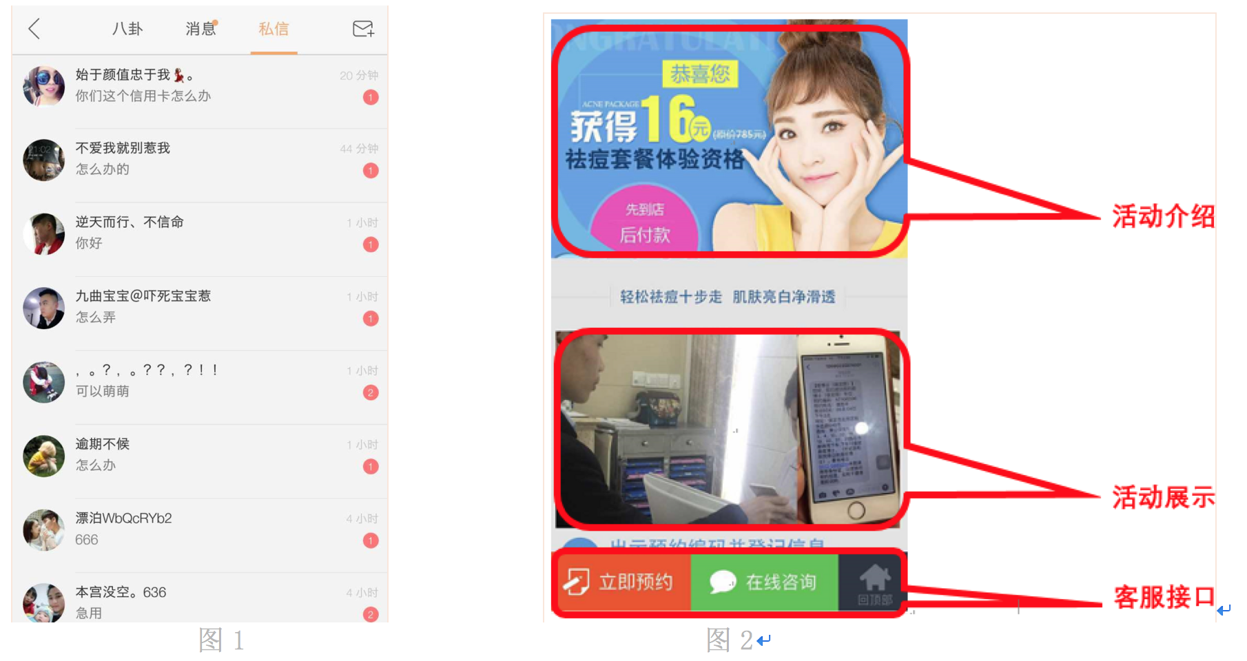 - 图2是某祛痘产品在快手推广的H5页面客服接口及活动的展示;