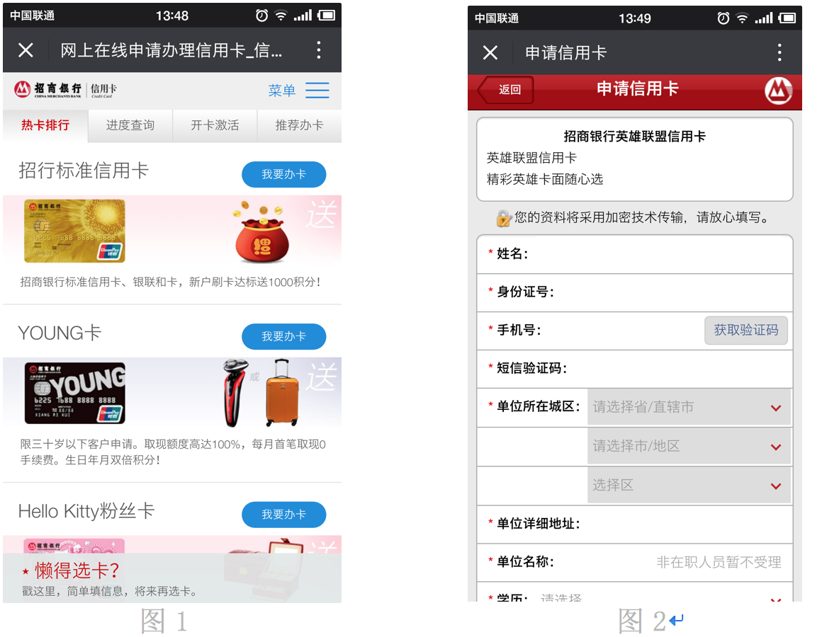 - 图2是招行信用卡在后续投放过程中更加直接的落地页,通过精准定向推给目标用户,且直接给到用户需要填写的信息页面,减少用户选择;