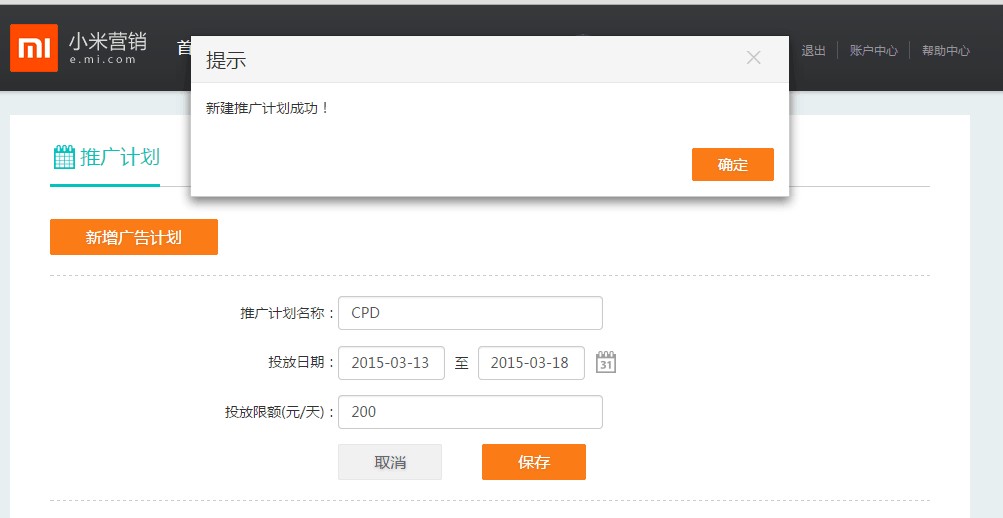 填写推广计划名称、投放日期、每天CPD投放限额,并保存。