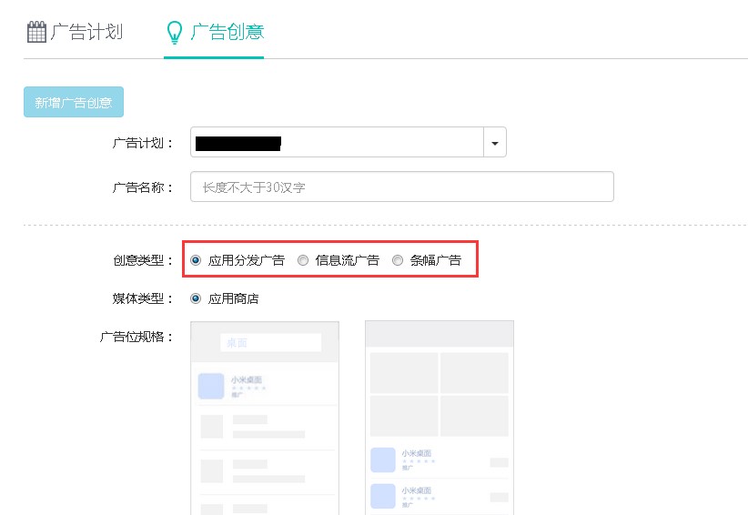 创意类型:用于选择投放的位置,仅可选择”应用分发”、”信息流广告”“条幅广告”。