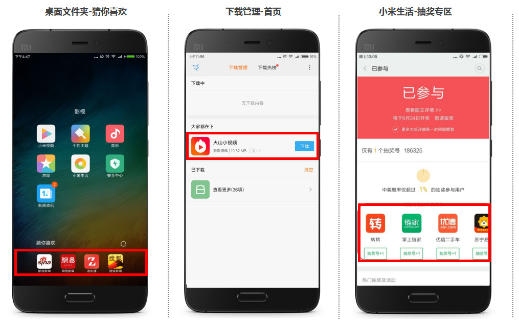 小米其他资源包括MIUI小米生活、小米视频、小米音乐、桌面文件夹-猜你喜欢、下载管理器等多个APP分发场景。