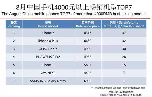 而在4000元以上机型中,苹果的iPhoneX和iPhone 8 Plus依然表现强势,拿下榜单前两位。而值得一提的是,OPPO Find X在8月也达到了销量30万台,排在第三位,成为该价位段受欢迎的安卓手机。同时华为P20 Pro销量也达到了28万台排在第四,iPhone8、vivo NEX旗舰版以及三星Note9分列5~7位。