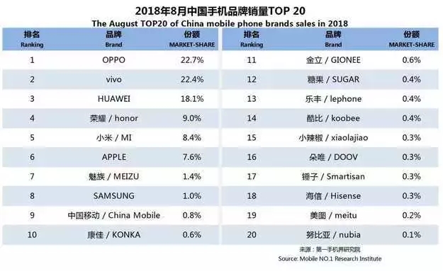 根据这份数据来看,在今年8月份的国内线下市场,OPPO手机拿下22.7%的市场份额排在首位,vivo紧随其后排在第二,拿下22.4%的市场份额。华为(不含荣耀)以18.1%排在第三,荣耀、小米和苹果分列4~6位,份额均在8%左右。