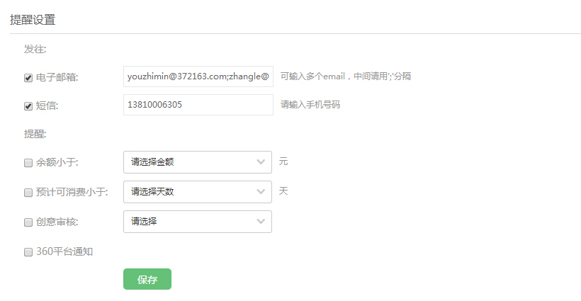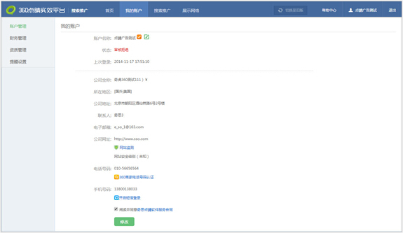 ②我的360推广账户:可在“我的360推广账户"中设置账户信息,为360推广账户充值,查询充值记录及360账户余额,管理360账户推广资质,以及设置提醒等