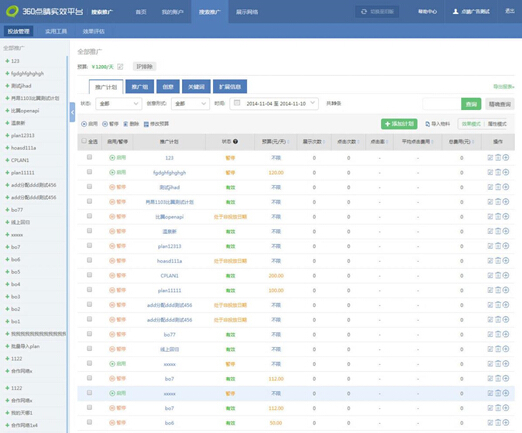 ①360广告投放管理界面(搜索推广默认显示界面):对您的物料进行添加,修改,删除等操作