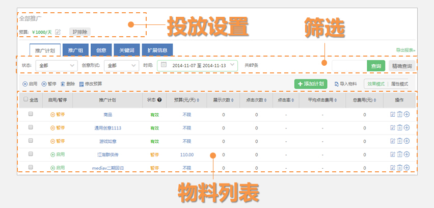 ③物料列表:可进行投放设置,导入新物料,或单独查看360推广投放数据等操作