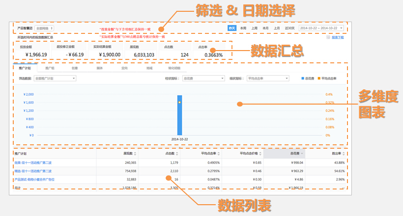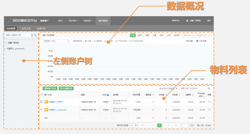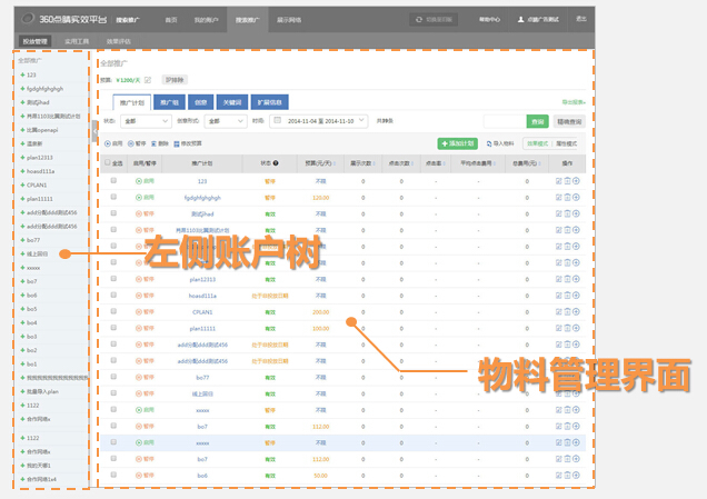 ③360搜索推广:可在360搜索推广中管理360搜索推广物料及查看详细360推广效果数据