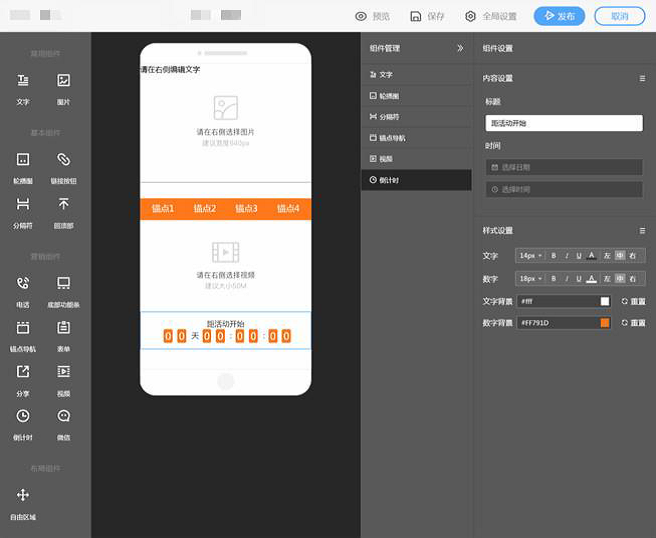 •样式设置:支持倒计时文字及数字字号/加粗/斜体/下划线/颜色/对齐设置,文字和数字背景色设置