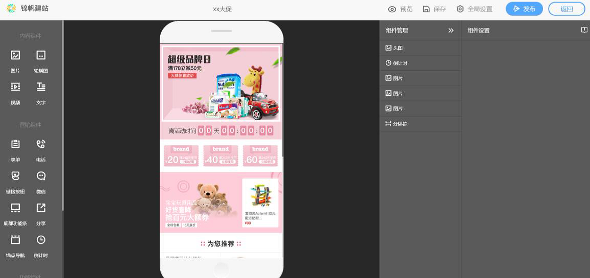 内容设置:编辑所选中的组件的内容,设定组件的参数。