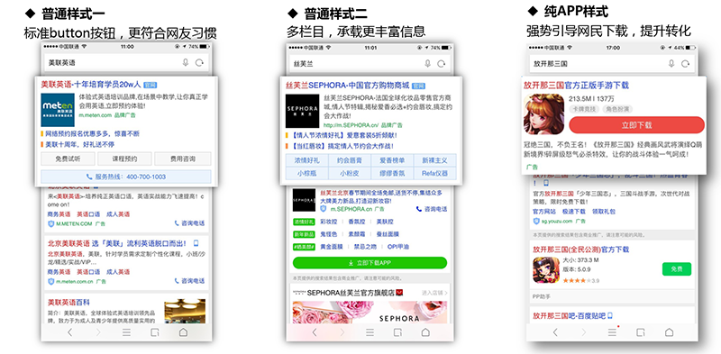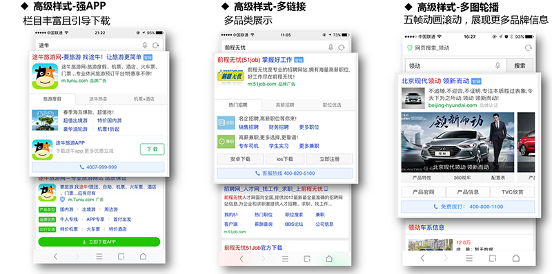 神马搜索品牌专区广告对应不同行业不同类型的品牌有多种样式可以选择,并分根据展示面积分为普通样式、高级样式和定制样式。可以根据不同需求进行选择。