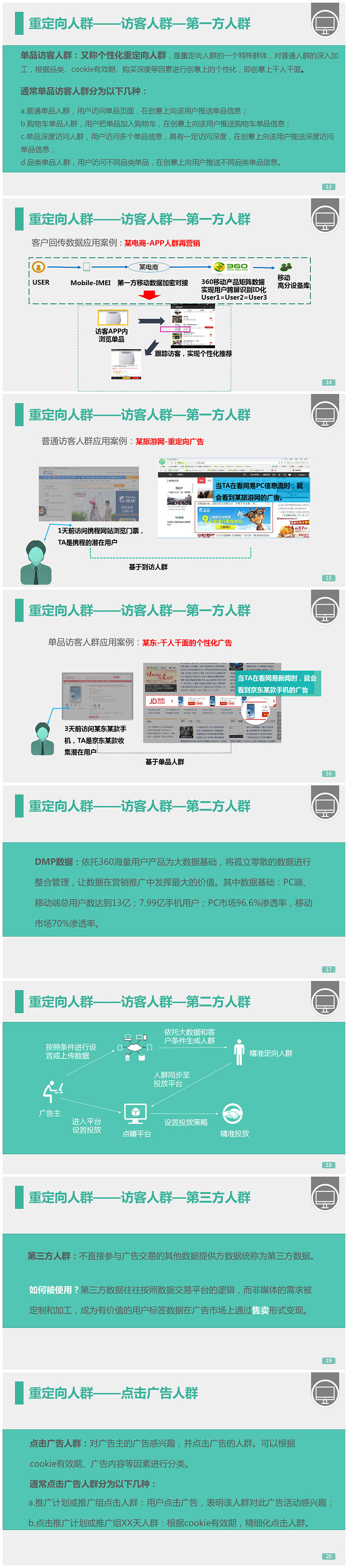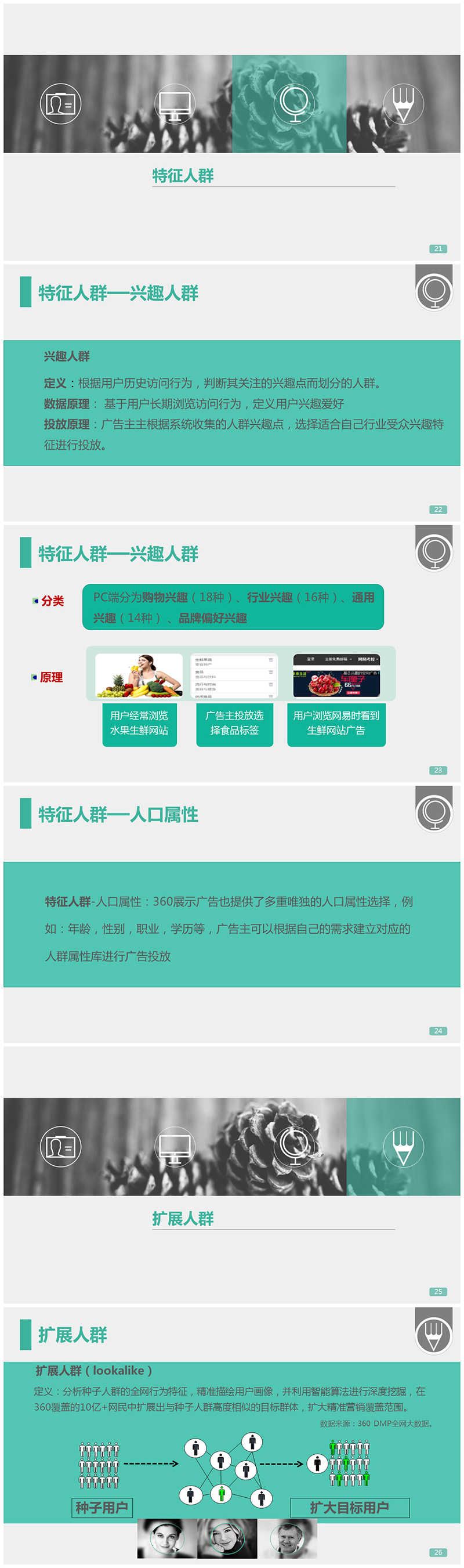 小编说:360展示广告人群管理主要从四个方面进行讲授。人群架构图、重定向人群、特征人群、扩展人群。以不同的人群区分来增加广告投放的精准性。