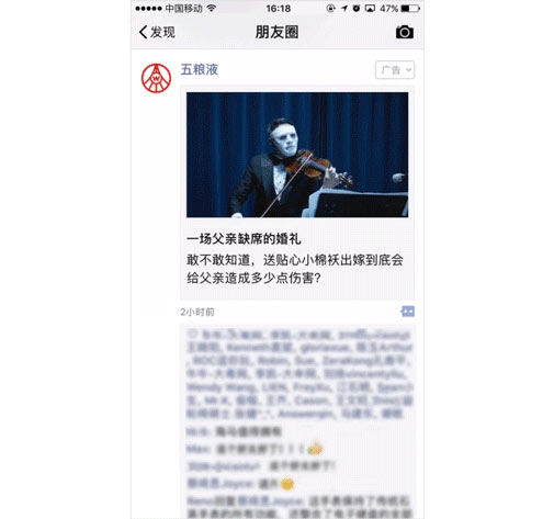 借助微信朋友圈基础式卡片视频广告,五粮液讲述了女儿出嫁时想起父亲点滴陪伴的感人故事,塑造出五粮液与施华洛世奇合作的新品“缘定晶生”作为亲缘、友缘与姻缘美好见证者的品牌形象和价值。
