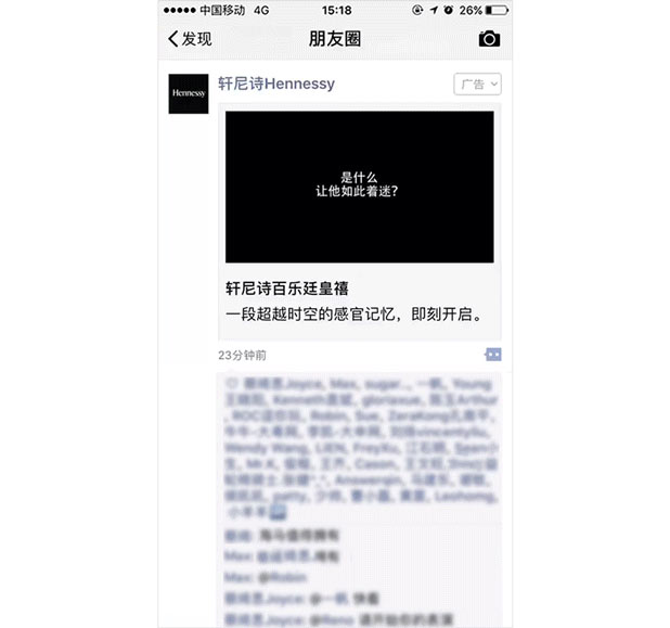 倾力缔造“甄选的艺术”的高端干邑单品——轩尼诗百乐廷皇禧,则是借助微信朋友圈基础式卡片视频广告,向大众讲述了调配总艺师品鉴与调配干邑的匠心故事。通过与目标人群进行品牌价值的深层沟通,轩尼诗百乐廷皇禧融力量与精细为一体的形象瞬间跃然眼前。