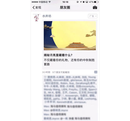 水井坊借势中秋营销节点,洞察用户对中秋参与感的强烈需求,以用户节日饮用场景体验为中心,以“碰杯”送祝福的创意互动形式为内核,与用户进行情感上的深度链接互动,成功激发用户的参与热情。腾讯朋友圈广告主视觉注重中秋氛围的渲染,用户通过碰杯送祝福的花式玩法聚焦品牌,通过现代化调侃式的祝福语引发共鸣,也展现了品牌在行业内的创新引领地位。