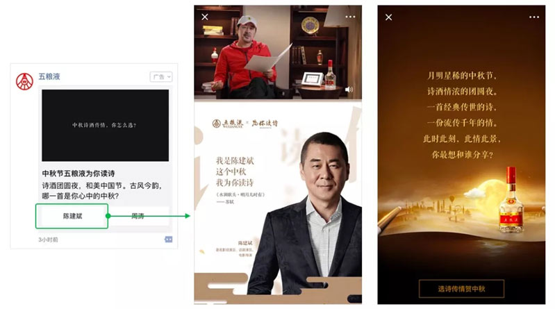 自古以来诗酒不分家,中秋节五粮液联合诵读节目《为你读诗》发起“明星为你读诗”品牌事件,并借助朋友圈选择式卡片广告,为IP合作增添社交价值。用户可根据自己的喜好二选一,或听陈建斌吟诵优美宋词,或听周涛朗读现代诗歌,在一曲新词一杯酒中,在传承千年的大国浓香里,感受中华文化的团圆与和美。