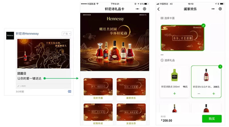 中秋销售旺季,轩尼诗借助朋友圈广告+微信小程序礼品卡的全新玩法,以情景社交互动带动品牌口碑传播及线上转化,实现品效升级。
