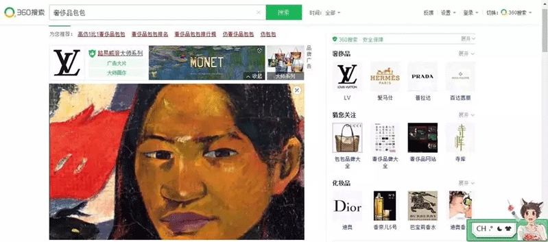 针对关注奢侈品大品类的LV潜在用户,360搜索品牌臻选可在其搜索奢侈品、包包、香水等相关信息时,优先显示LV品牌信息,引起用户对LV的兴趣,深度挖掘潜在消费倾向。
