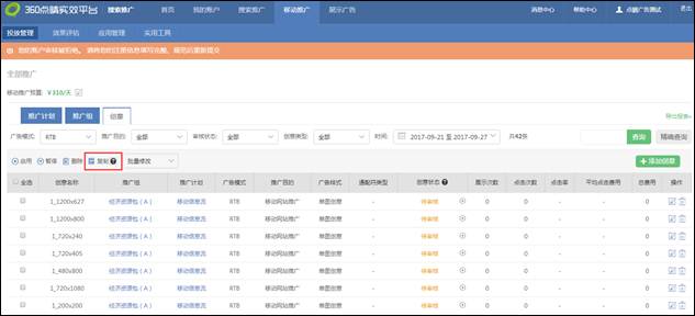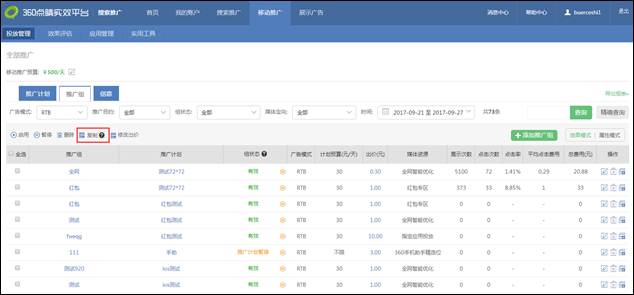 功能概述:复制功能,即为360移动端支持推广计划、推广组、推广创意三个层级的复制操作,将有效提高搭建360推广账号的效率。