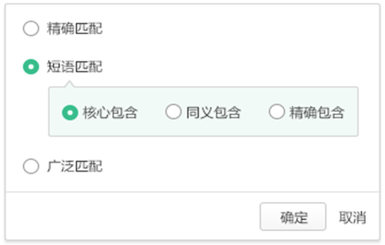 高级短语在短语匹配中提供了三种匹配选择,您能够通过这三种方式精准控制关键词流量。这三种新的匹配选择分别是:核心包含、同义包含、精确包含。