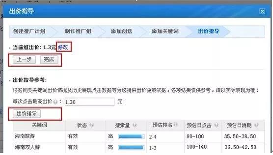 系统会提示出所添加关键词的排名、点击消耗等信息,帮你确定出价。