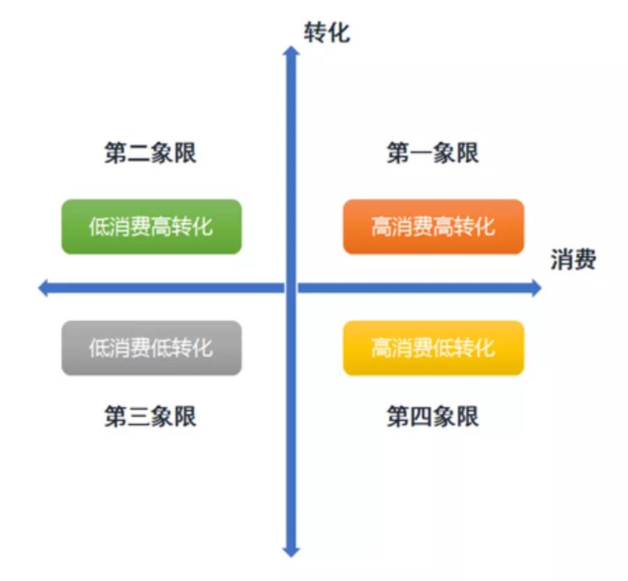 在关键词出价统计表的基础上,我们可以做出来一张图,这是作优化时必备的四象限图,四个象限分别表明了四种不同的消费/转化状态。360广告