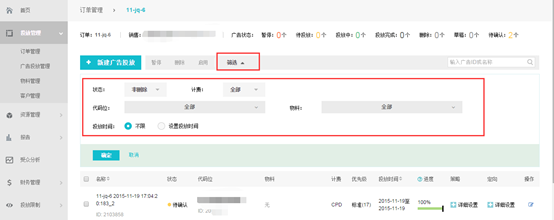 点击360推广平台中的筛选,还可以按照状态,计费,代码位,物料,投放时间等查找订单下的投放