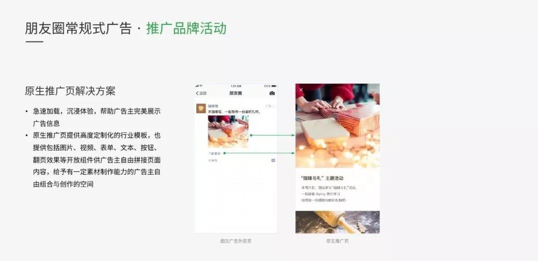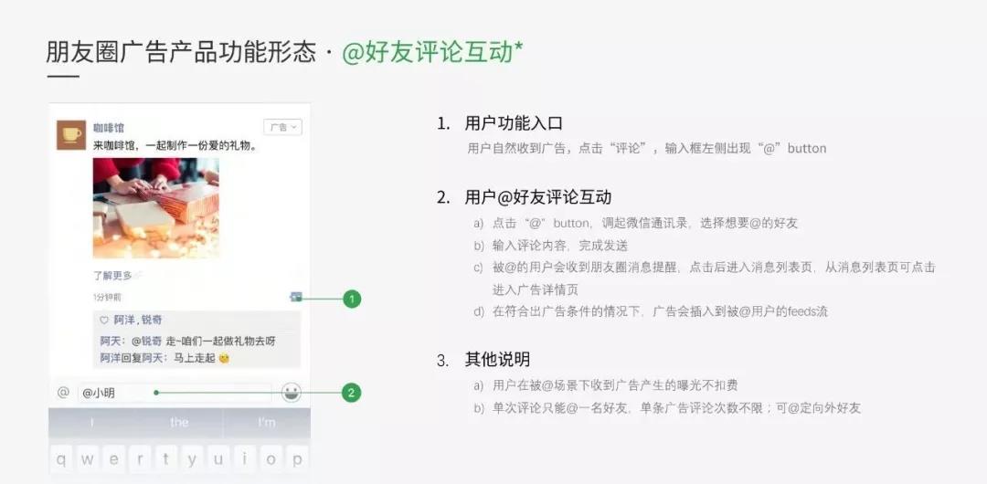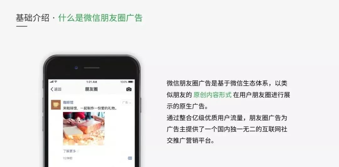 什么是微信朋友圈广告:微信朋友圈广告时基于微信生态体系,以类似朋友的原创内容形式在朋友圈进行展示的原生广告。