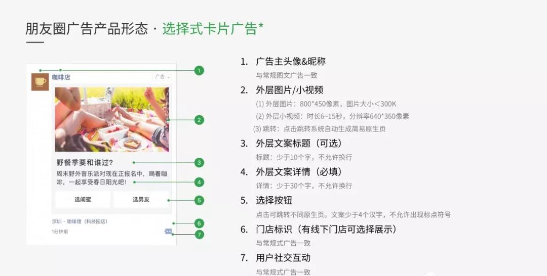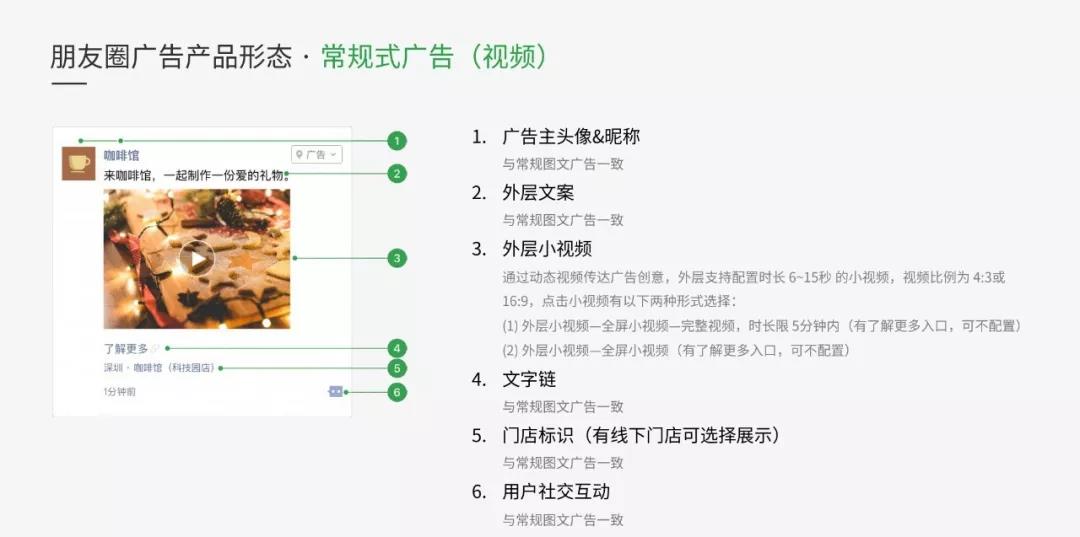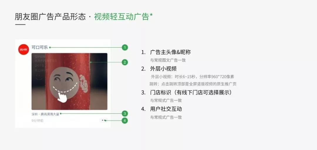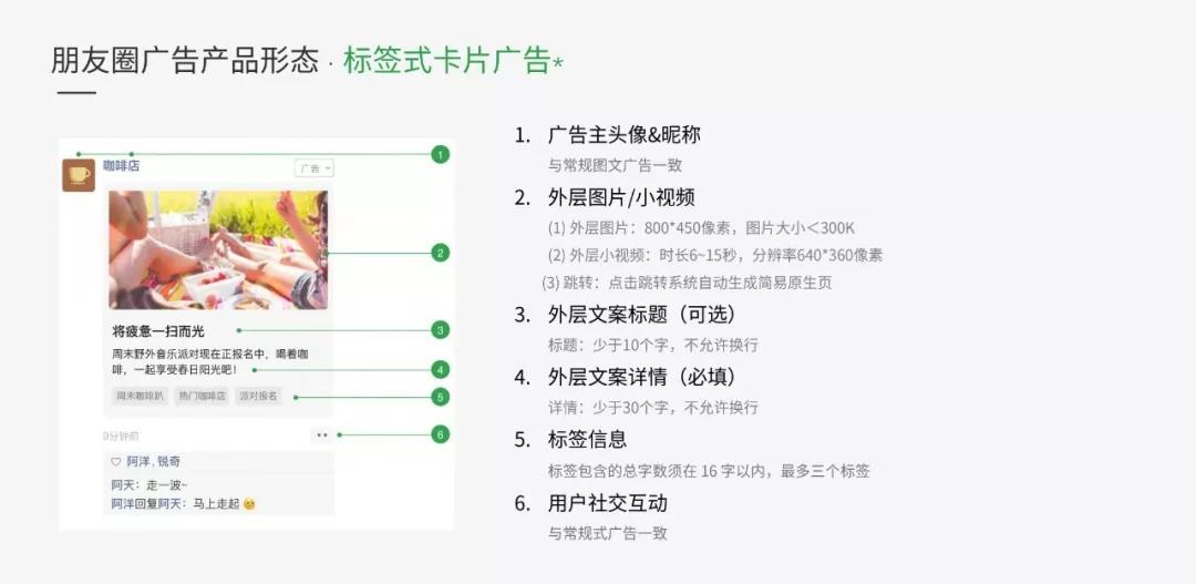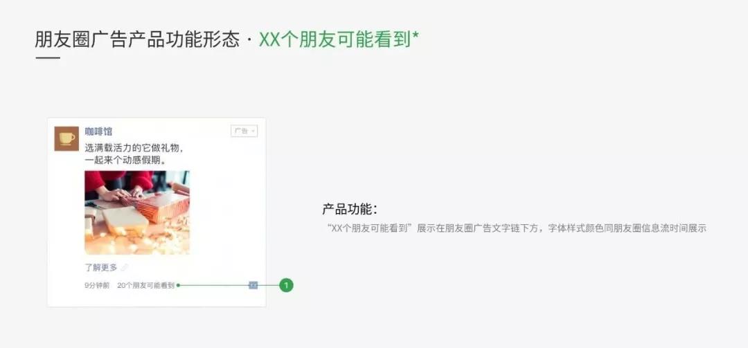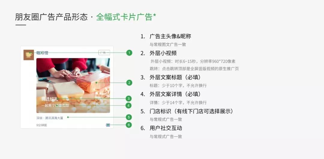 微信朋友圈广告产品形态:常规式广告(图文、视频),基础式卡片广告,选择式卡片广告,标签式卡片广告,全幅式卡片广告,视频轻互动广告,@广告主互动,XX个朋友可能看到,@好友评论互动,明星品牌合作介绍页,限时推广广告