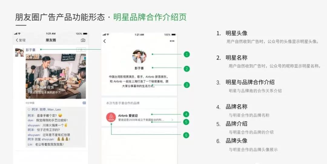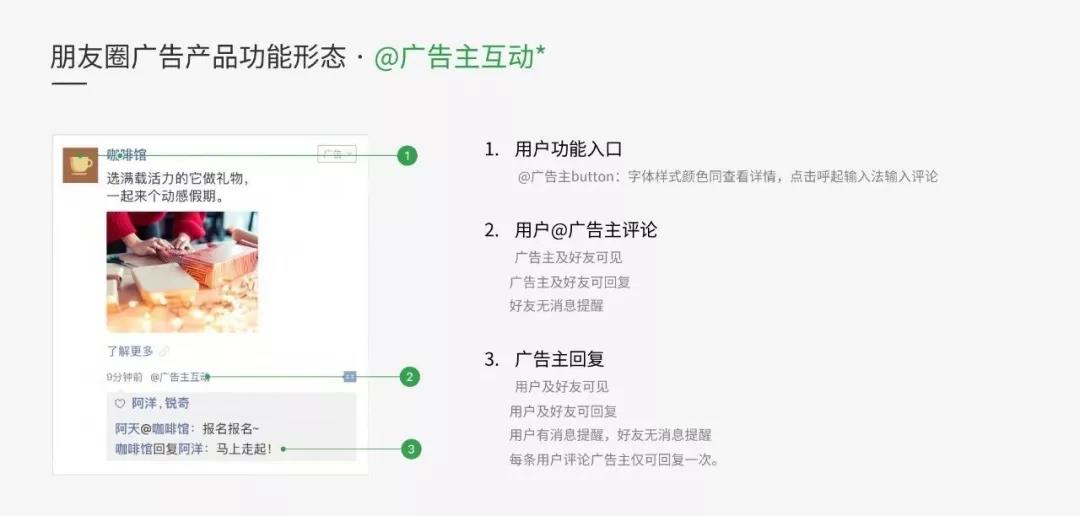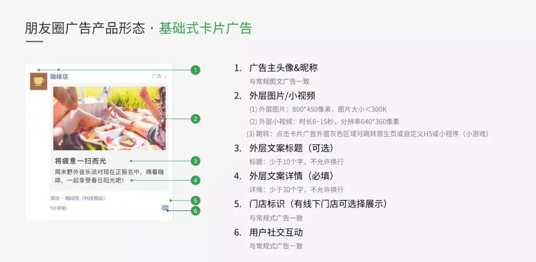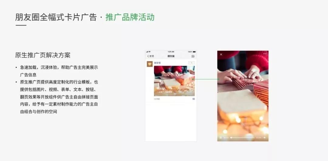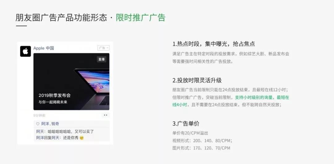 微信朋友圈广告产品形态:常规式广告(图文、视频),基础式卡片广告,选择式卡片广告,标签式卡片广告,全幅式卡片广告,视频轻互动广告,@广告主互动,XX个朋友可能看到,@好友评论互动,明星品牌合作介绍页,限时推广广告