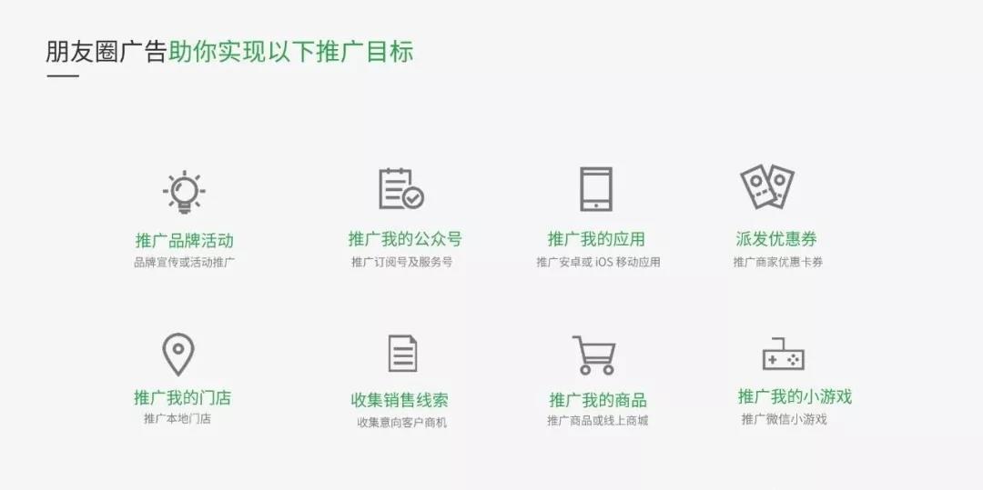 微信朋友圈广告可以帮助实现的推广目标:推广品牌活动、推广公众号、推广应用、派发优惠券、推广门店、收集销售线索、推广商品、推广小游戏