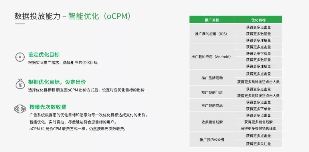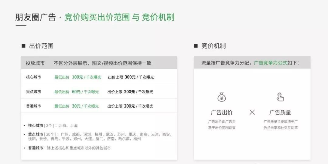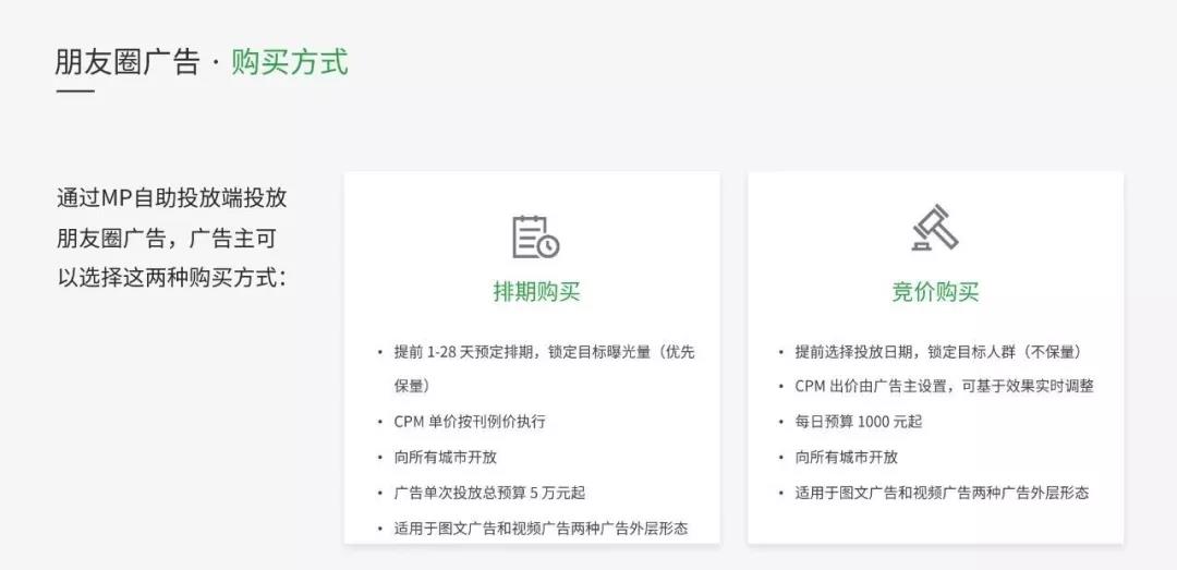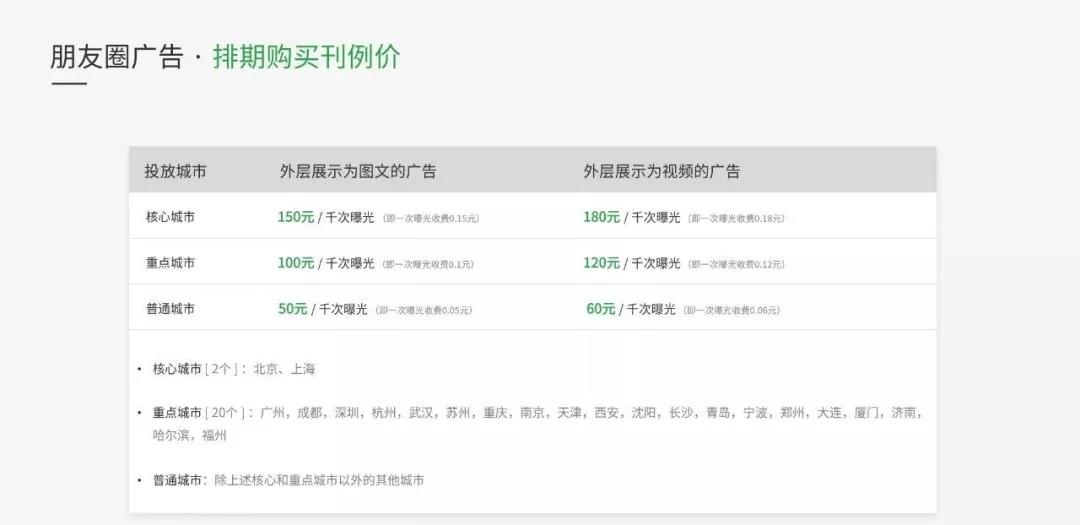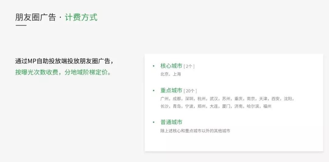 微信朋友圈广告收费方式:cpm(按照曝光次数收费(分地域阶梯定价))