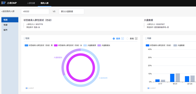 观察生成的人群包画像,可获取性别、年龄、城市、TGI等信息同时可与目标人群或是大盘人群进行对比。如果吻合,可进一步拓展投放;如果不吻合,需进行相应的优化调整。