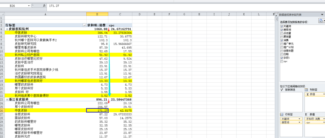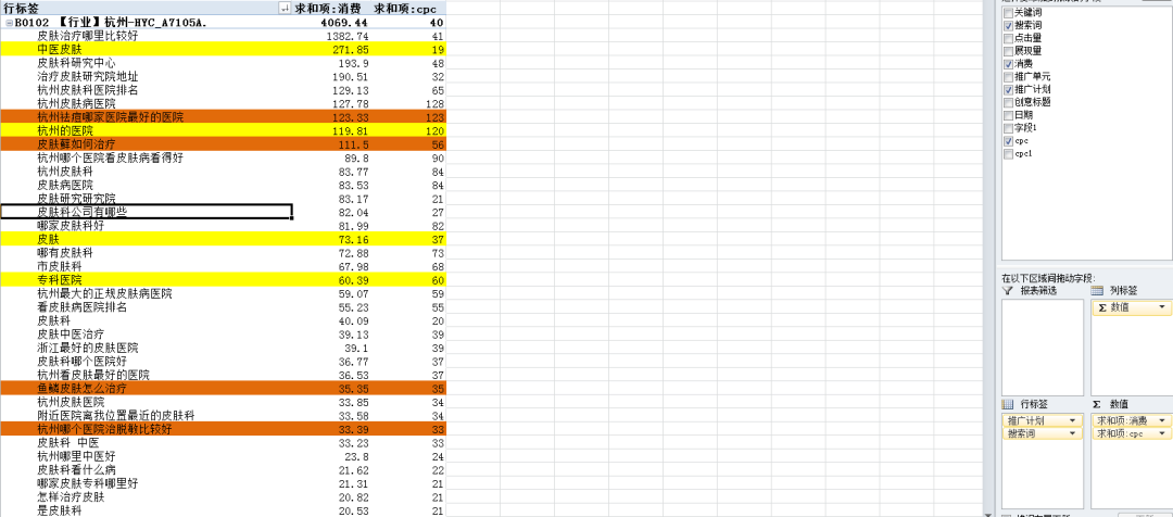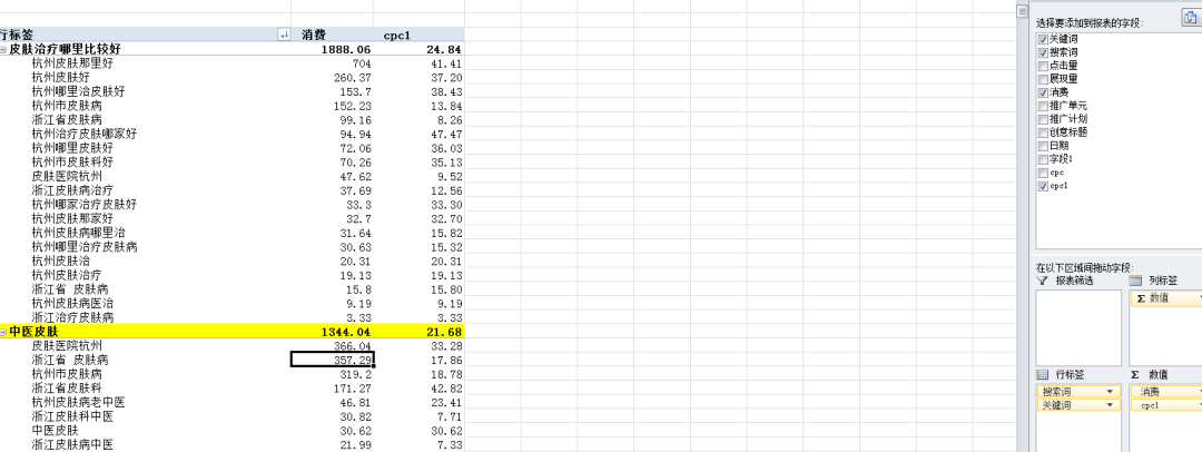 • 分析目的:主要看一个周期内,搜索词消费是否异常,比如:标黄的“中医皮肤”,这样不带任何意向的通用关键词,短时间内被消耗了1344元,且cpc达到了21块,非常夸张。