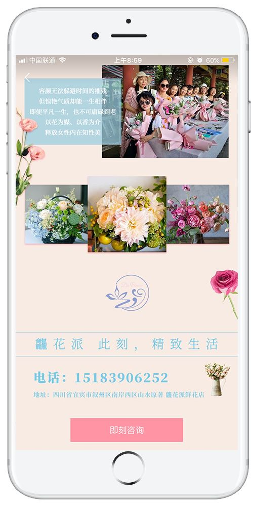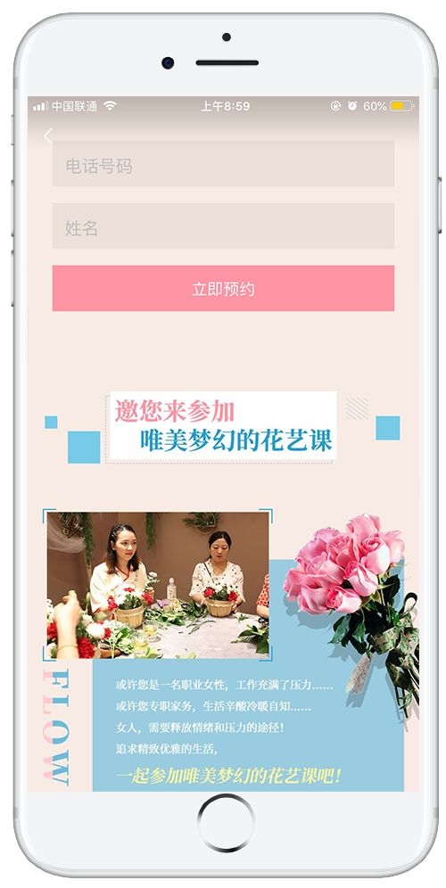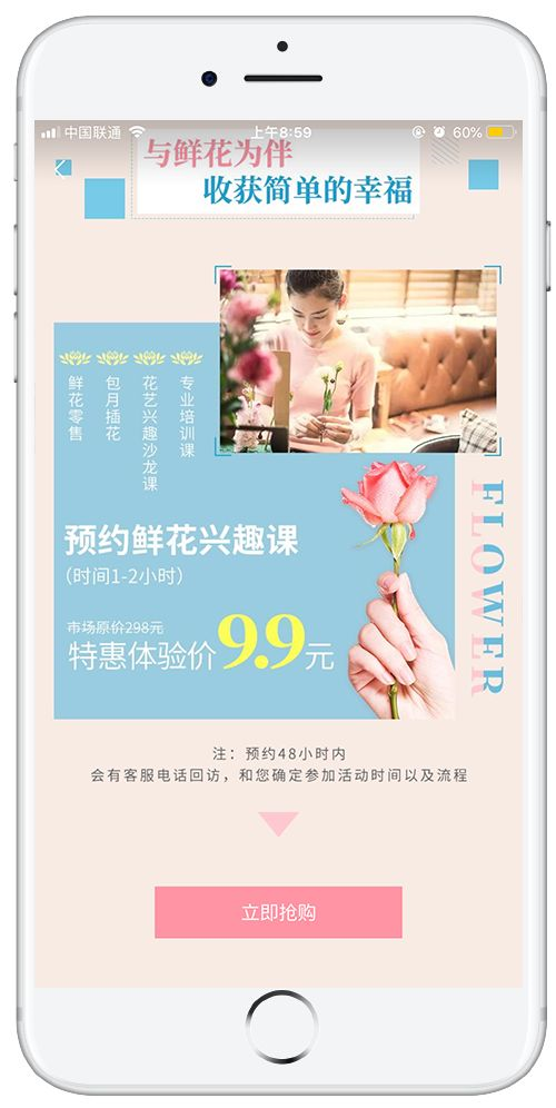 2、微信朋友圈广告投放落地页策略落地页引导用户下单留资,传递精致优雅生活美学。吸引目标用户点击广告后,接下来只有引导用户留资并促成下单购买,才能算完成了整个微信朋友圈广告投放营销闭环。第一,内层首页设置6图连播,粉色与蓝色的插花课场景图与外层交相呼应,引导用户浏览下方的特色教学课程;滑动图片实现多图呈现,提升用户体验感。第二,仅9.9元的特惠花艺课紧邻立即购买按钮,超高优惠刺激用户点击报名参加课程。同时,立即下单按钮后设置留资表单,吸引客户留资,将那些仍旧对产品心有疑虑的用户“一网打尽”!第三,内层广告素材均采用花艺培训课程实景图和店内的鲜花图片,突出龘花派高薪聘请国内优秀的插花培训师,所用鲜花均从国外进口,专业的教学能力、精美的鲜花品质,让用户放心来店报名参加课程。