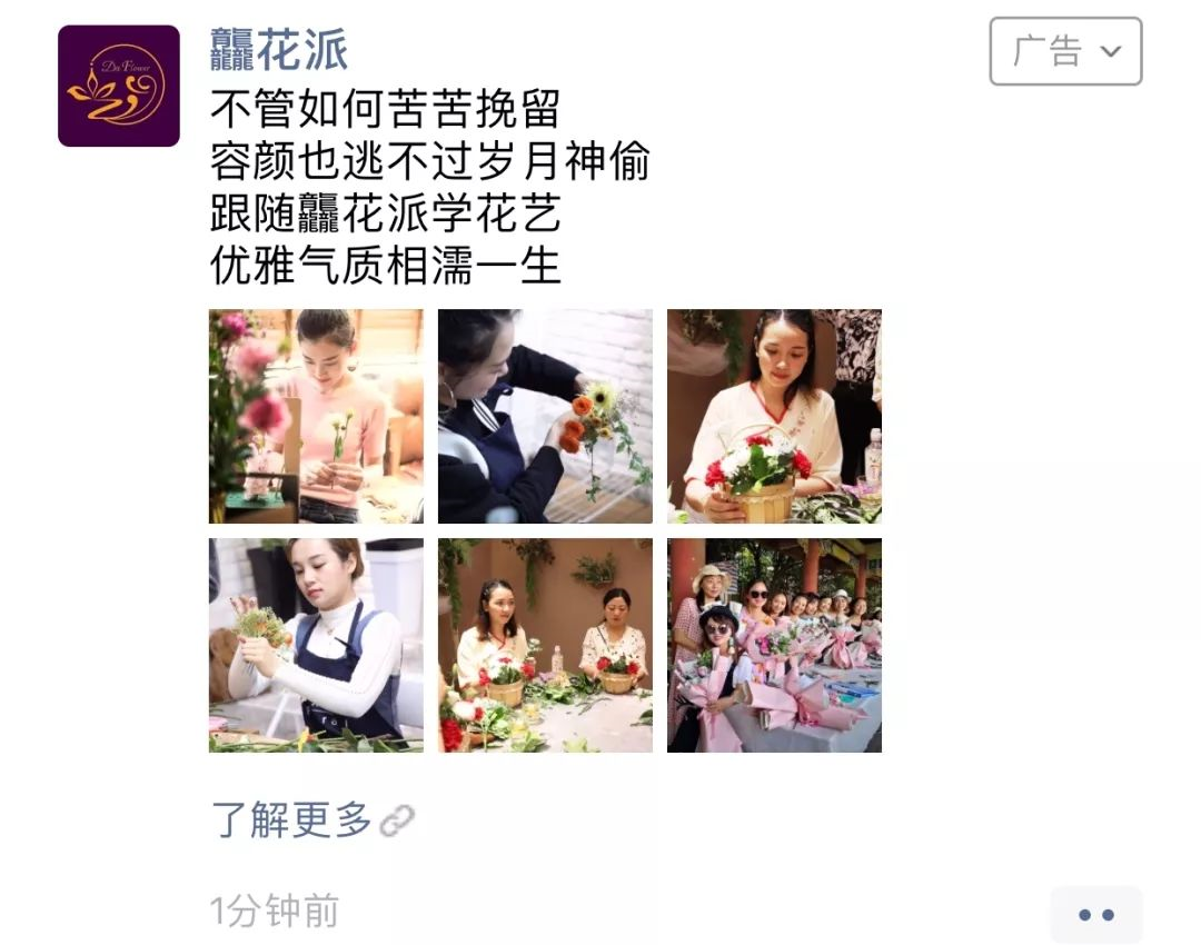 简短的微信朋友圈广告投放文案把握女性爱美、追求年轻气质的心理,受众曝光的第一眼即被吸引,使得龘花派在当地的知名度又提升了一层。