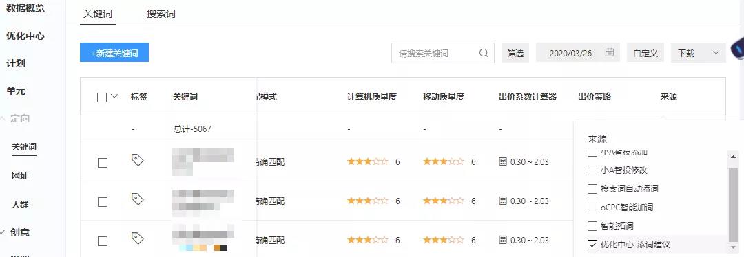 若需要查看推荐关键词投放情况,可筛选来源“优化中心-建议添词”后查看即可